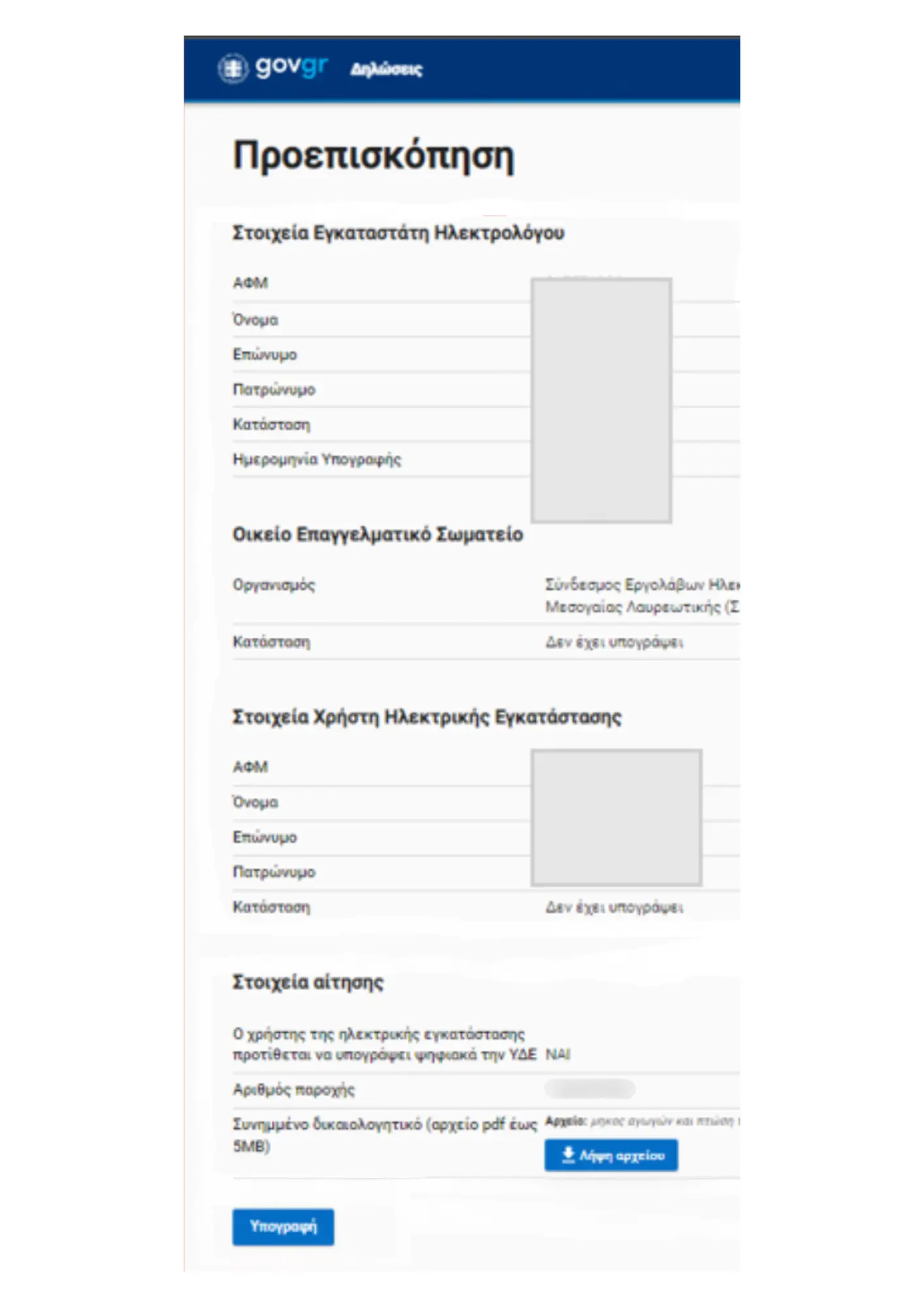 - Τον ΑΦΜ του ηλεκτρολόγου που συνυπογράφει